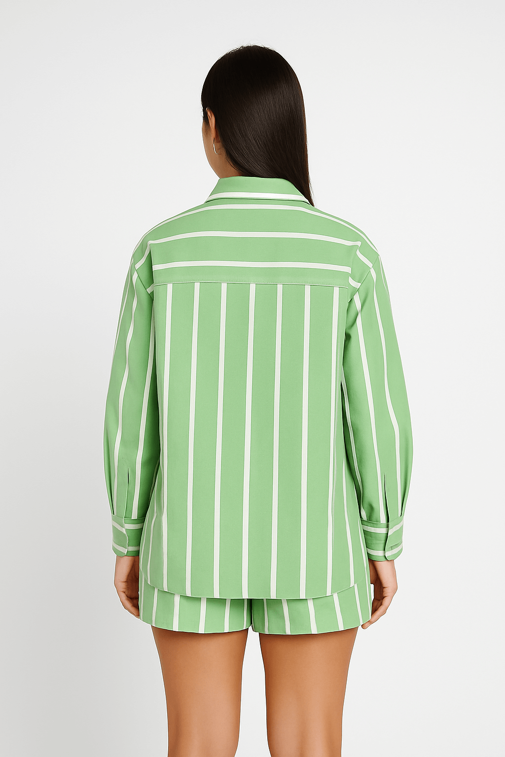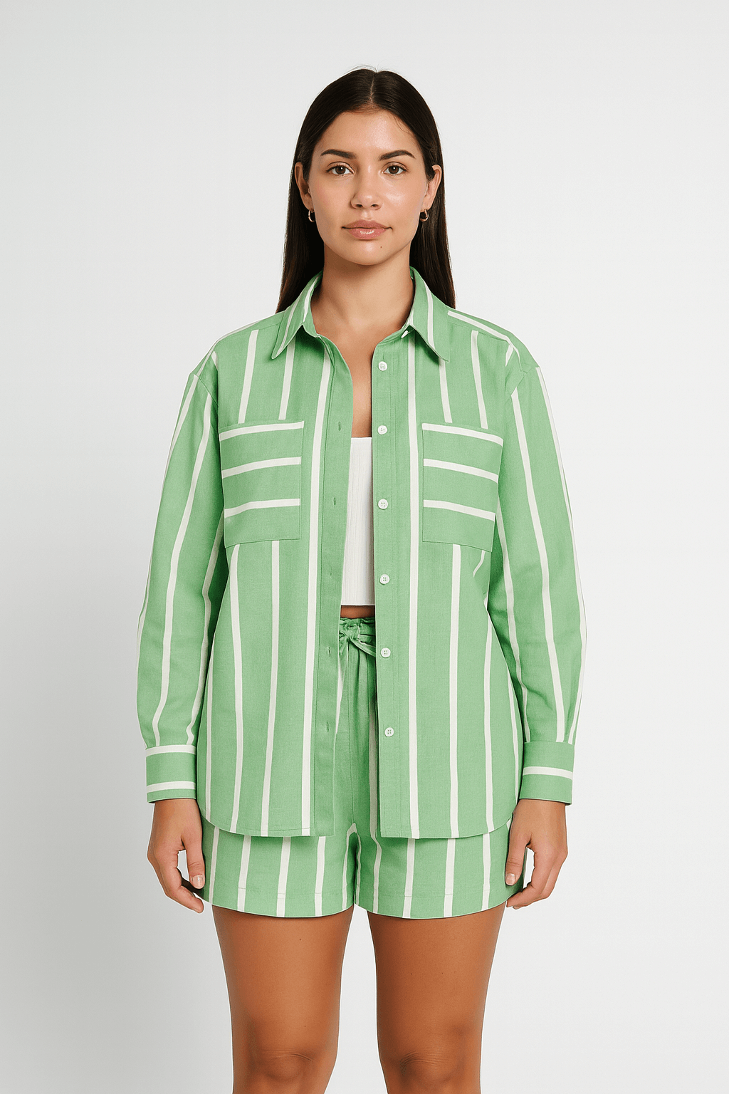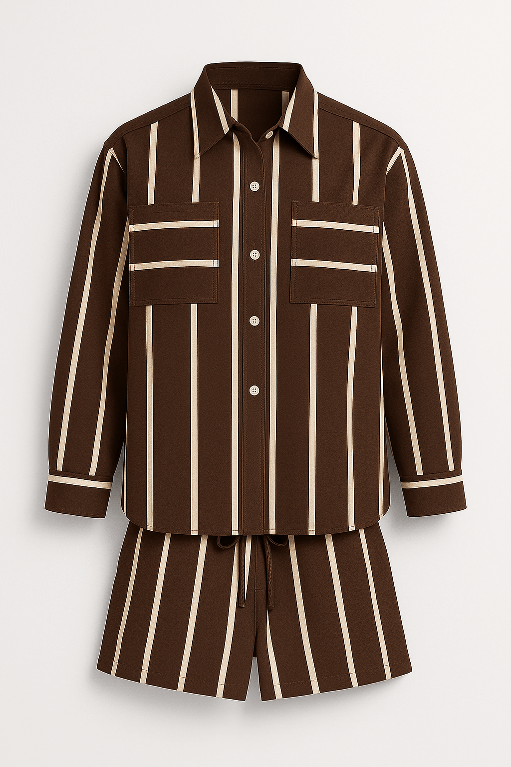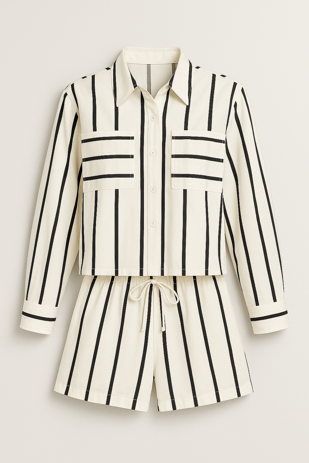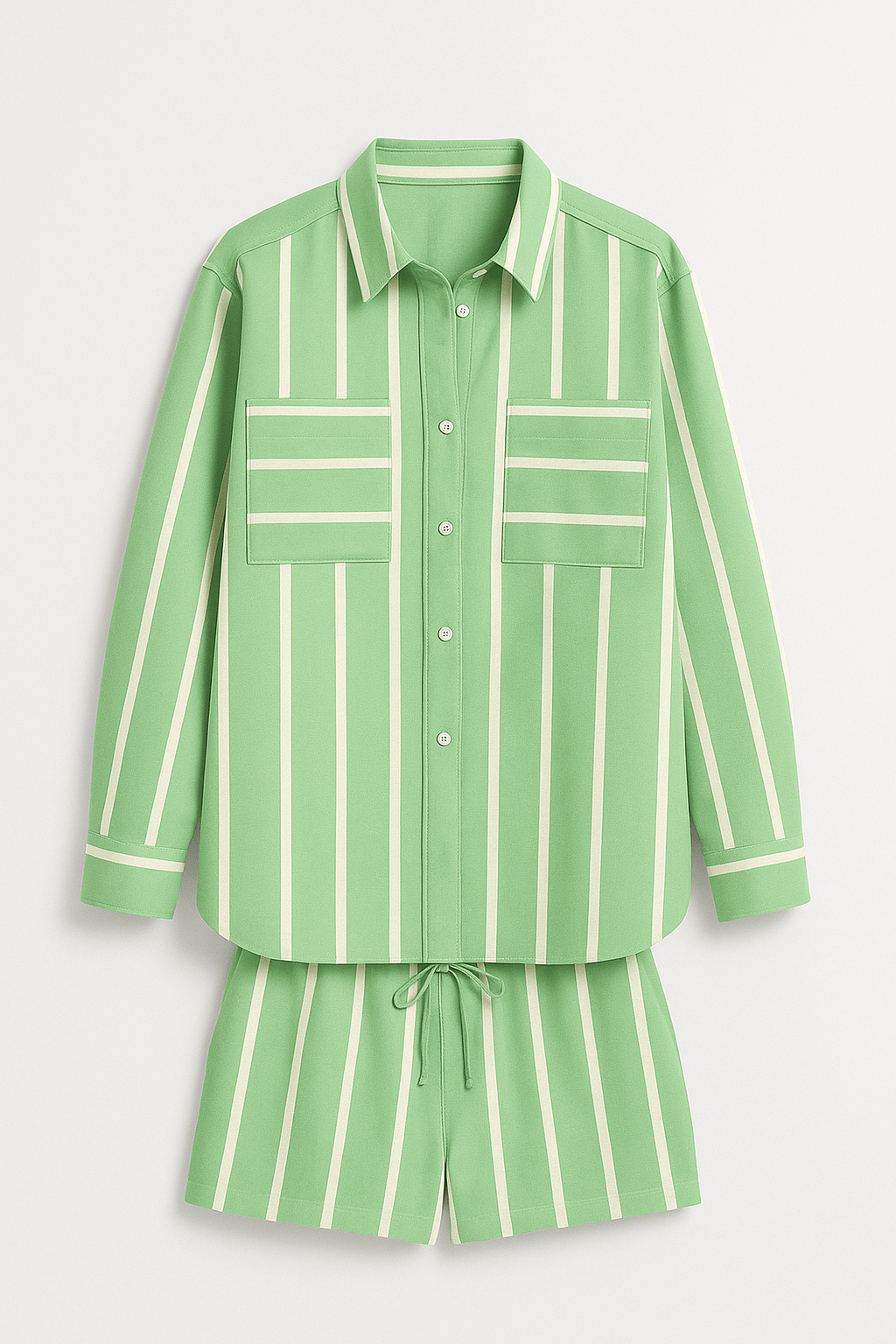 Women's Loungewear Set – Striped Two-Piece Cardigan & Shorts – Relaxed Fit Cotton Blend